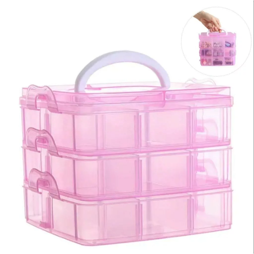 São 3 camadas contendo 18 espaços para organizar e armazenar suas bobinas, miçangas, botões, bijouterias, pérolas, acessórios pequenos e muito mais!